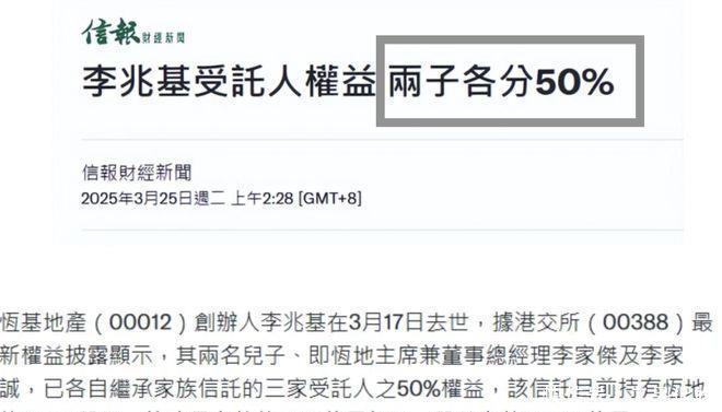 李兆基的遗产分配出炉,果然是传男不传女,儿子李家杰和李家诚各得百分之五十,1400多亿港元的财产,两人各分得700亿。